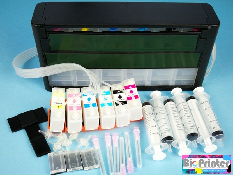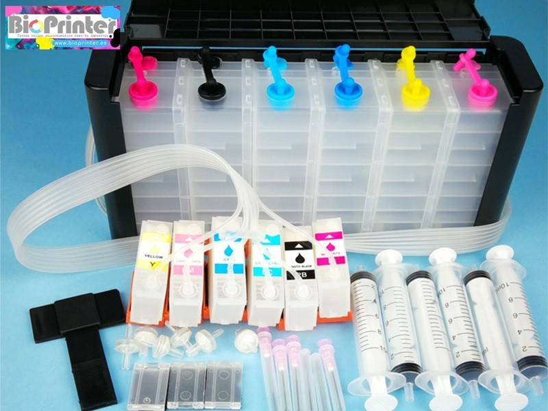 CISS o Sistema de suministro continuo  tinta luxury para impresoras Epson que utilizan el modelo de cartucho 378 378XL. Los cartuchos incorporan un chip autoreset, no se necesita reseteador.