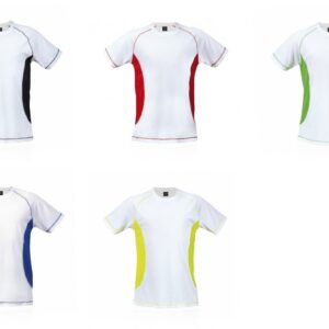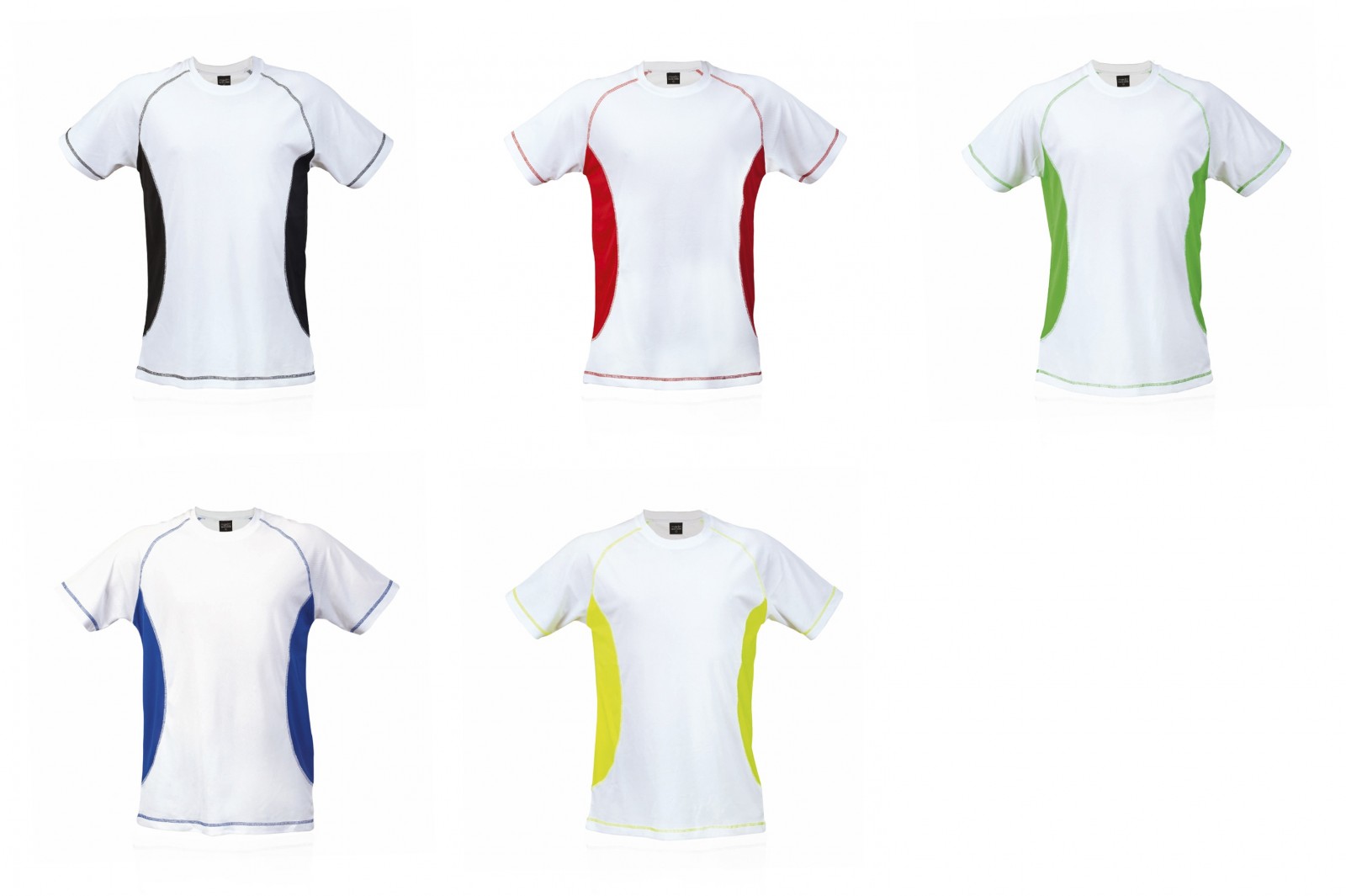 Camiseta técnica para adulto en material 100% poliéster transpirable de 135g/m2. Diseño en color blanco con costuras de refuerzo y laterales en vivos colores.