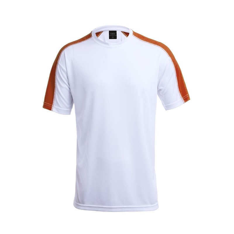 Camiseta técnica para adulto en material dynamic, altamente transpirable y confeccionada en tela 100% poliéster de 135g/m2. Original diseño en color blanco, con franja de color en las mangas. Disponible en variados colores