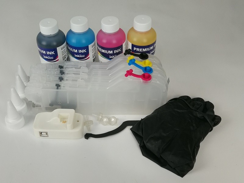 Pack 4 cartuchos recargables vacíos de Alta Capacidad reseteables y reseteador de chip, compatibles con Brother LC3217 LC3219, mas 4 botellines de tinta de 100 ml. marca Inktec En este Pack tienes el equivalente a mas de 40 cartuchos originales. Ideal para casa, estudiantes, oficinas, profesionales… su utilización te ayudará a reducir los costes de impresión de forma notable sin renunciar a la calidad.