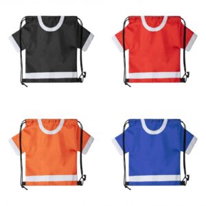 Original y divertida mochila de cuerdas para niños en forma de camiseta. En suave poliéster 210D, con cuerdas autocierre en color negro y esquinas reforzadas.