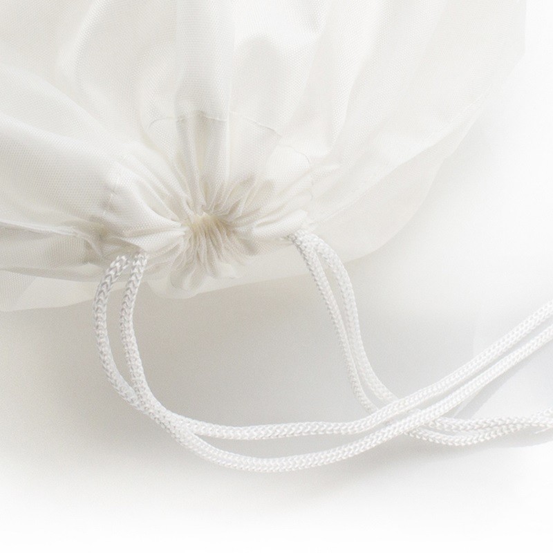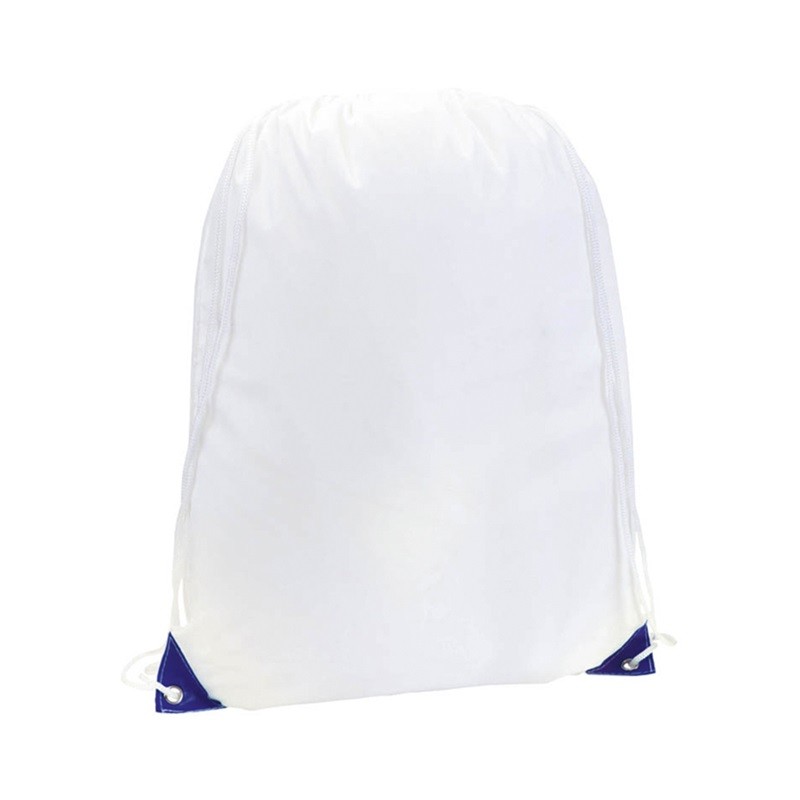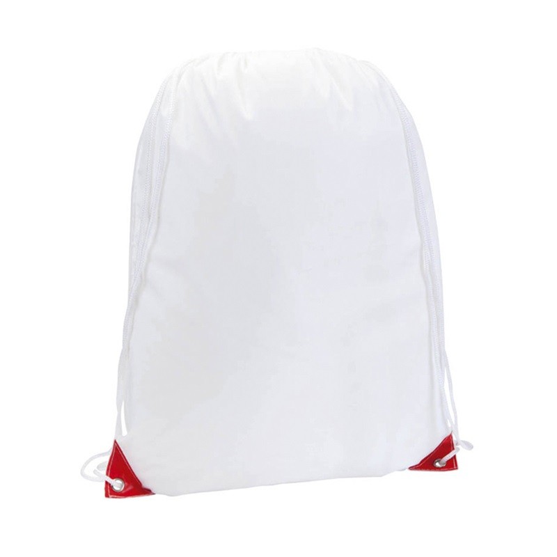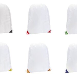 Mochila de cuerdas en suave poliéster 210T de color blanco con esquinas en alegres colores. Con cuerdas autocierre en color blanco y esquinas con argollas metálicas y refuerzo de polipiel.