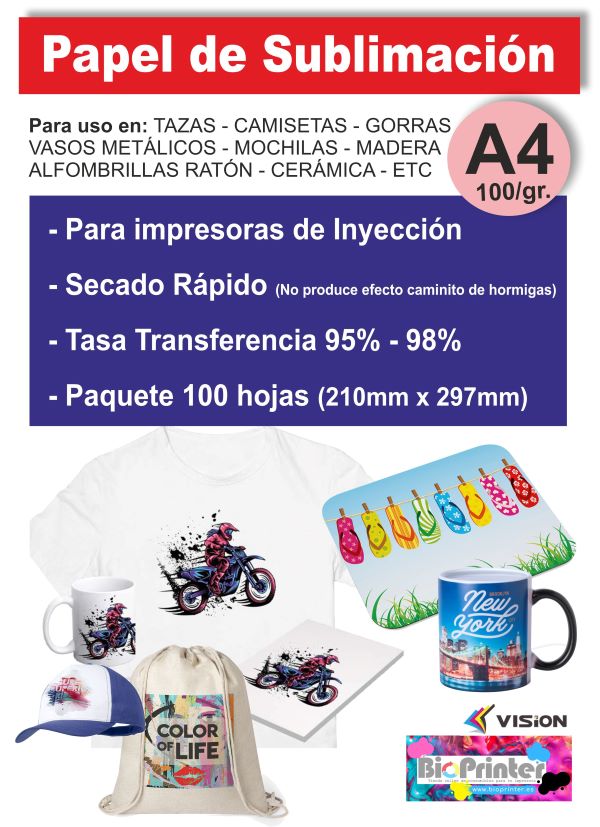 PAPEL DE SUBLIMACION TAMAÑO A4, PAQUETE 100 HOJAS 100g. SECADO RÁPIDO Y ALTA TASA DE TRANSFERENCIA.